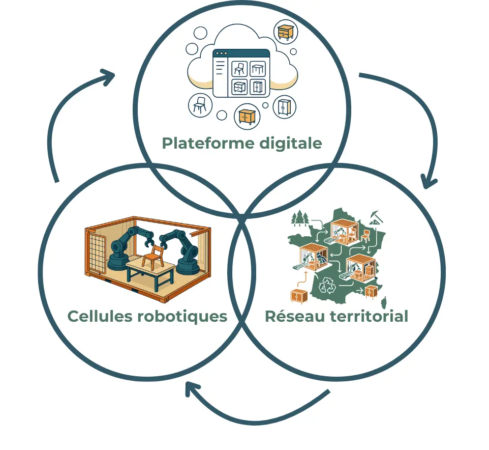 Notre IA propriétaire assemble un moteur de recettes paramétriques, une couche d'orchestration et un jumeau numérique de pilotage. Elle convertit votre intention en opérations robotisées sur des matériaux parfois irréguliers ou de réemploi.